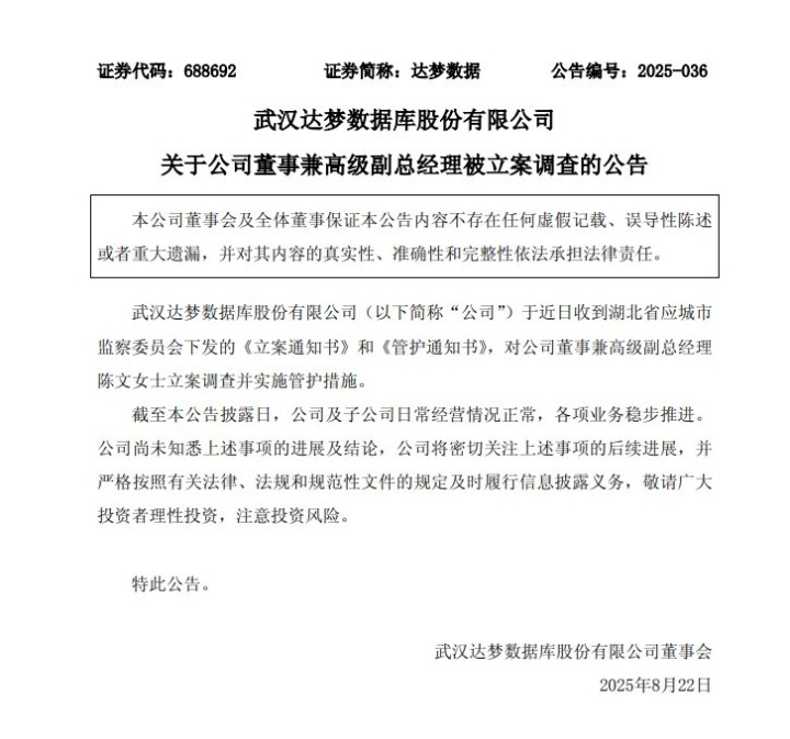 8月21日晚间,达梦数据(688692.SH)公告,近日收到湖北省应城市监察委员会下发的《立案通知书》和《管护通知书》,对公司董事兼高级副总经理陈文立案调查并实施管护措施。
