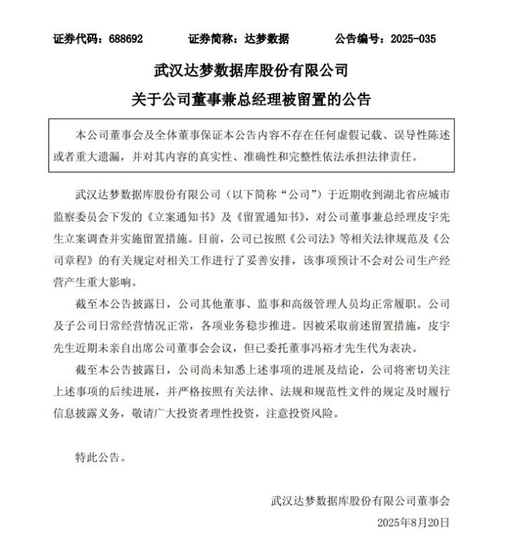 就在19日晚间,达梦数据已公告称,近期收到湖北省应城市监察委员会下发的《立案通知书》及《留置通知书》,对公司董事兼总经理皮宇立案调查并实施留置措施。因被采取前述留置措施,皮宇近期未亲自出席公司董事会会议,并委托董事冯裕才代为表决。